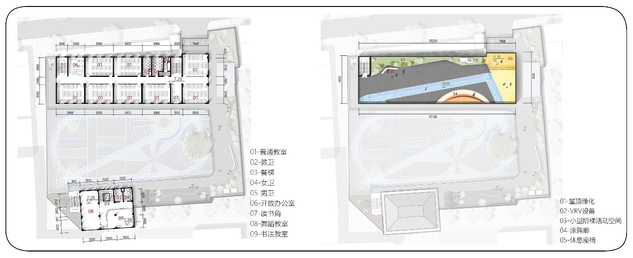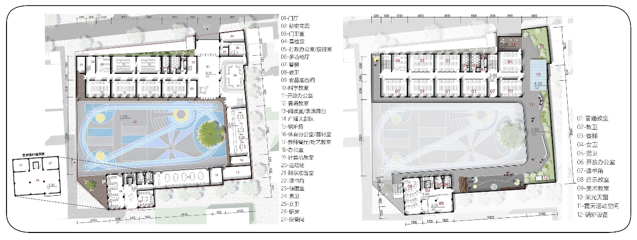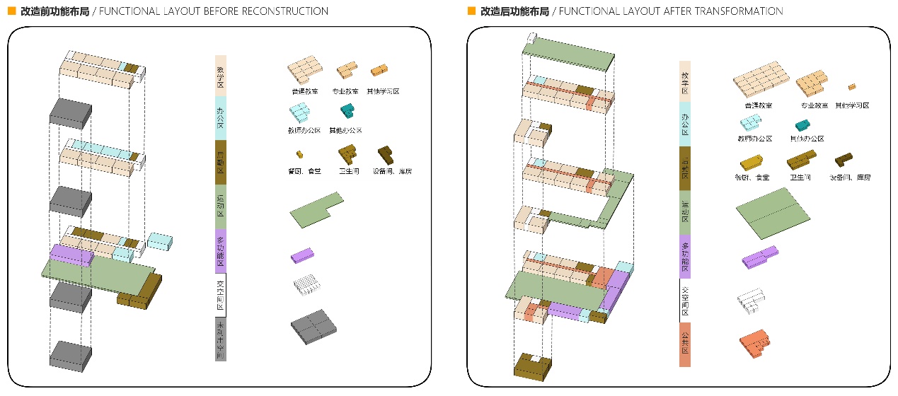 改造前,学校教学区比重较小,办公区比重较大。区域碎片化严重。改造后,增加了教学、后勤餐厨功能的占比,简化办公功能的分区,将交通空间进行功能的复合化利用。功能布局上,形成横、纵多方向的功能组合,增加了功能区之间的互动交流。