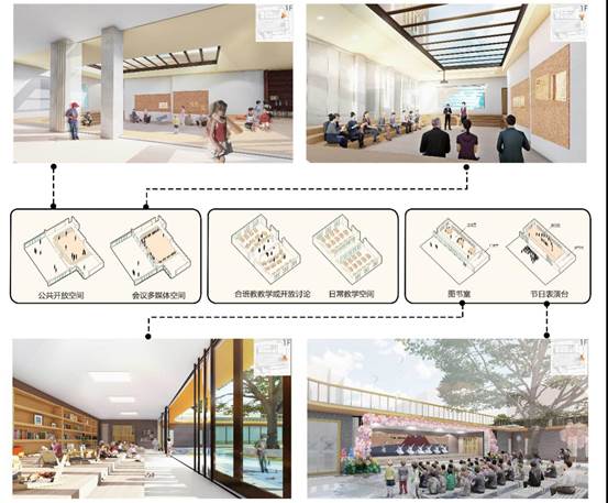 在特殊节日时,图书室可作为表演舞台使用,在此期间,多功能厅可作为候场室,广播室可作为设备间,保障表演活动的正常运行。多功能厅除了具有开会、讲座等专业功能外,也可作为学生休息、家长等待的空间。
