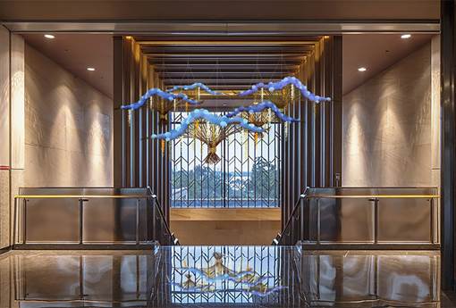 在空间造型上,延续建筑“绿色生命阶梯”的设计理念,结合安托山山脉的线条曲线与梯田的形态,提取流畅的曲线元素并深入演变至室内设计中。