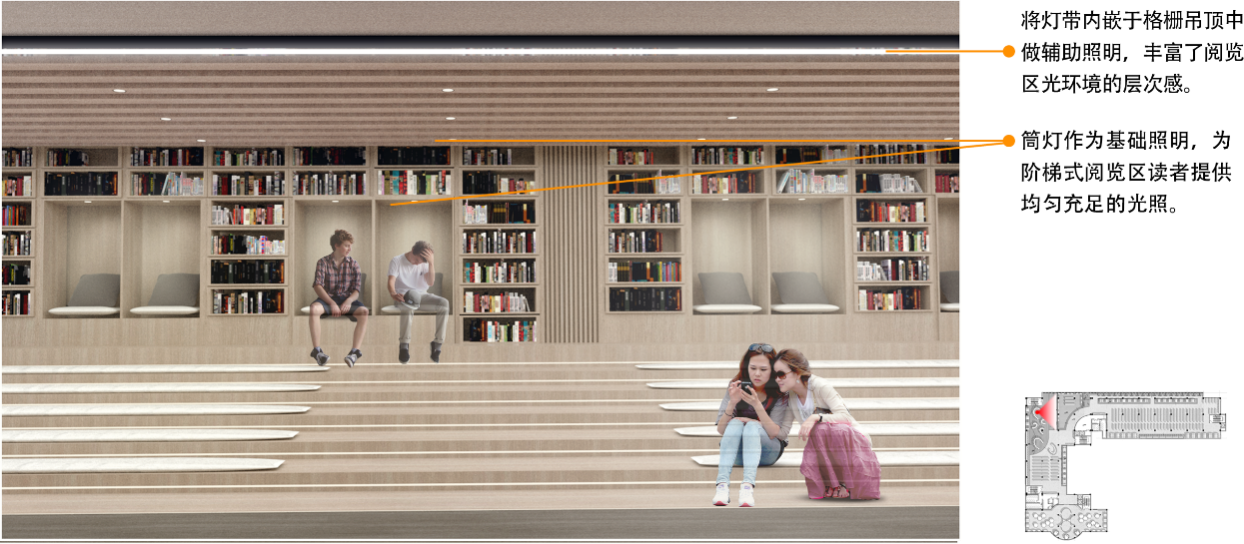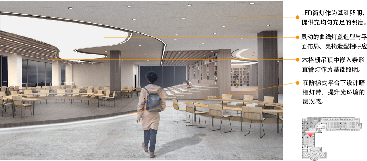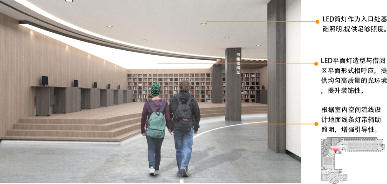 在入口的走道中,利用LED筒灯作为基础照明,提供足够照度。在借阅区设计阶梯式平台以增强空间的活力。设计灵动的平面灯造型与借阅区平面阶梯形式相呼应,营造光照充足、均匀、装饰感强的光环境。同时依据室内空间流线,设计地面线条灯带辅助照明,增强引导功能。