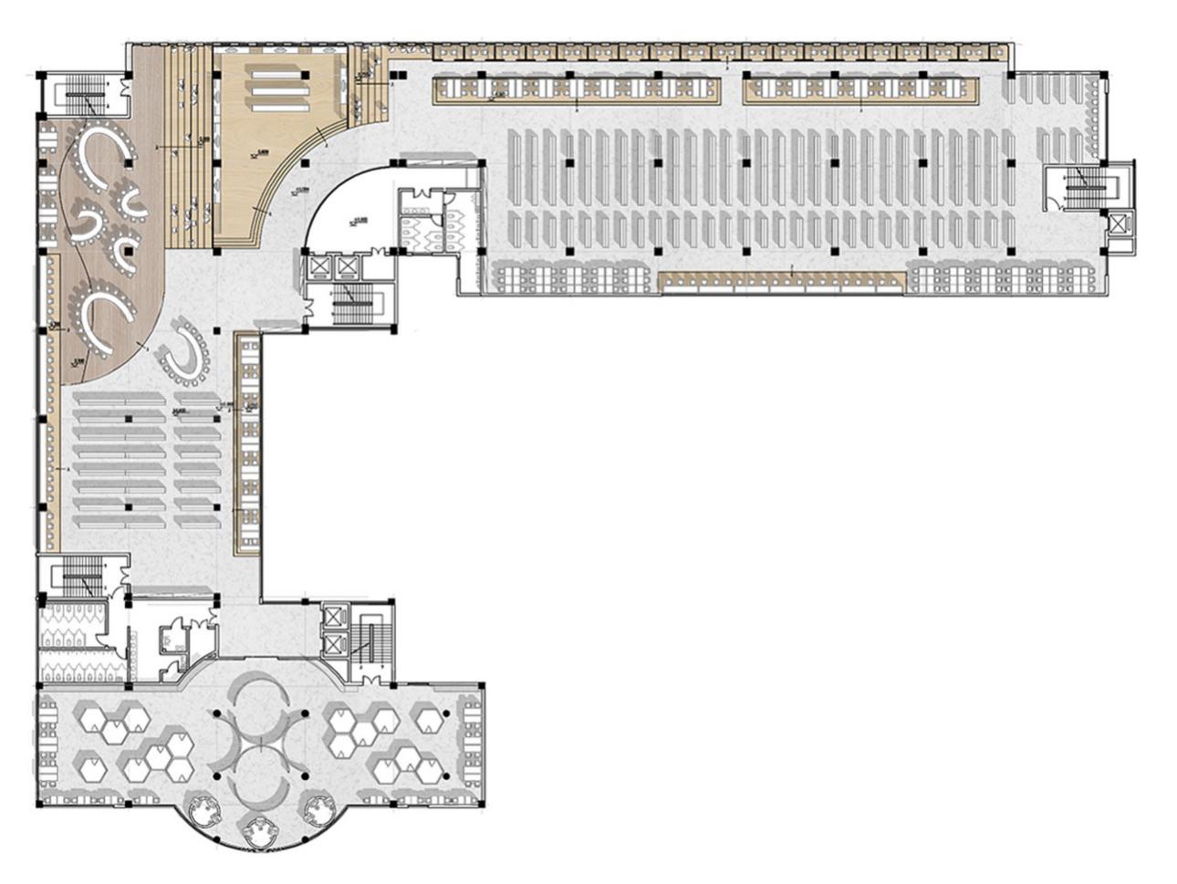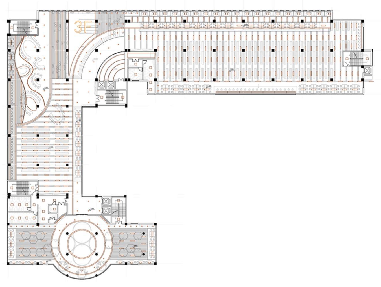 平面布局形式基于阅览空间原有的功能与布局形式,将空间进行重新划分为普通阅览空间、休闲阅览空间和独立阅览空间,同时保留原有的辅助空间和大部分藏书空间。其中,普通阅览空间采取分区布置形式,将阅览区与藏书区分离开来;休闲阅览空间采取成组布置,包含阶梯式阅览坐席、曲线造型的阅览桌、休闲阅览隔间,与普通阅览空间在形式上形成明显区分;独立阅览空间则采用单边对称式布置,单人坐席之间不易受到干扰,可以保证一定私密性。