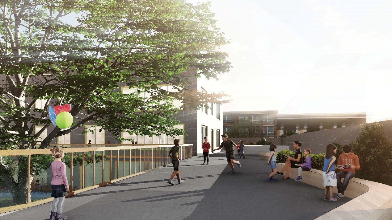 方案二:在整体布局上与方案一类似,但将二层屋顶空间进行利用,将主教学楼与艺术楼串联。