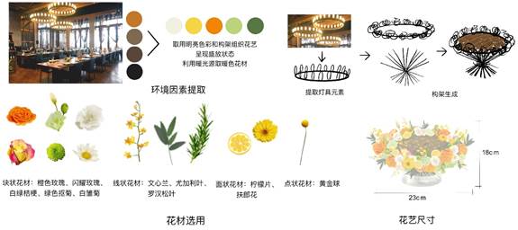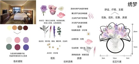 酒店卧室桌花是营造舒适就寝环境的关键,花艺陈设能给人带来视觉愉悦,还能疗愈精神压力。本方案通过花材色彩、质感、气味,营造出安神助眠功效的陈设氛围,期盼宾客有舒适香甜的睡眠,故取名“绣梦”。
