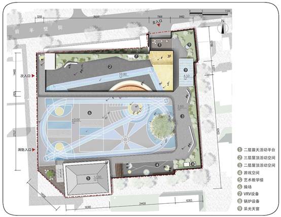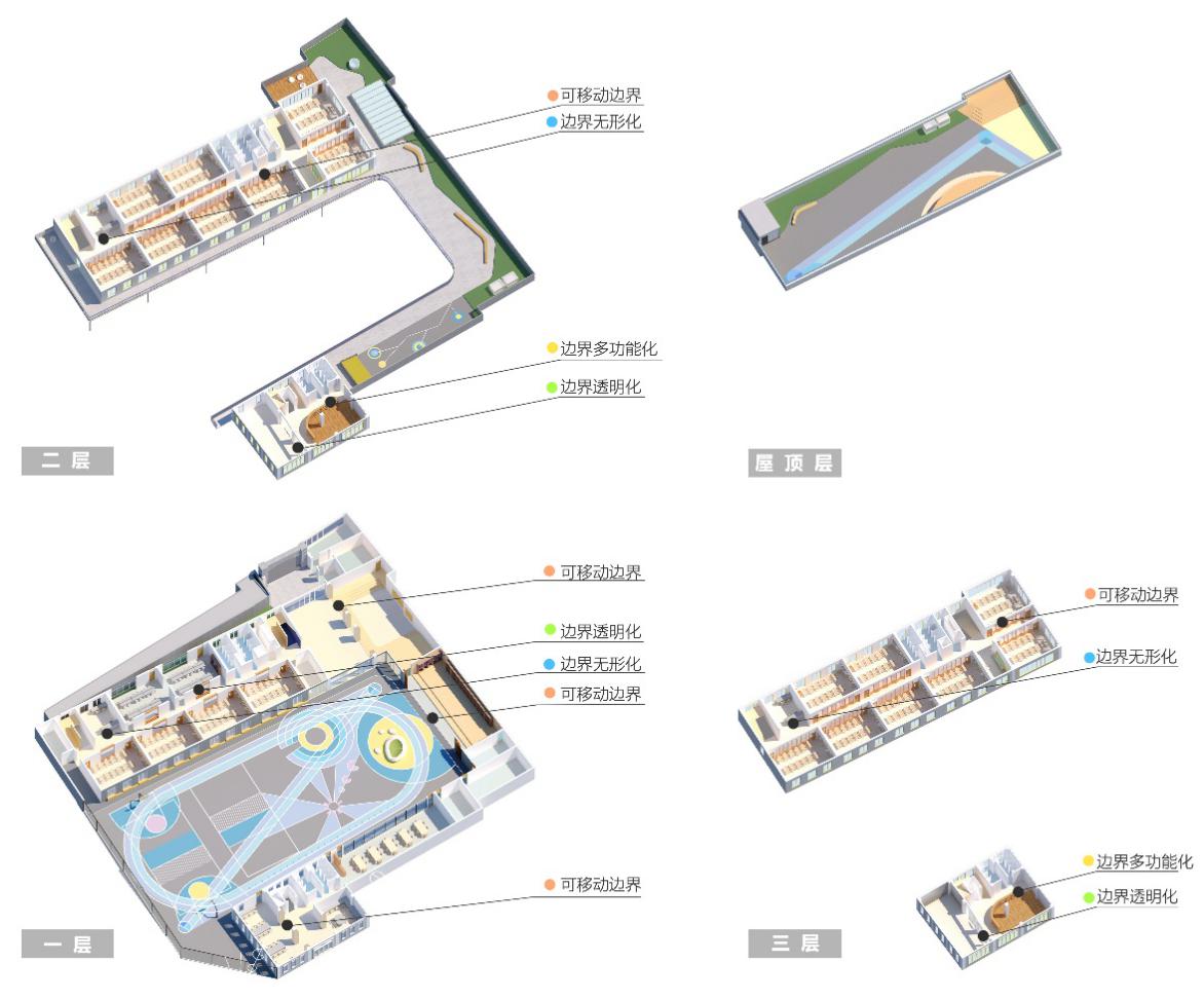 为了保证场地的完整性,在内部功能区的分布上进行灵活处理,用不同颜色进行地面划分,形成丰富有趣的活动场地。中间层与屋顶层的活动场地形态狭长,且受到层高及安全的限制,设计出小型游戏、休息、种植空间。通过形态、色彩、植物的搭配,呈现出场地中的视觉关联与整合。