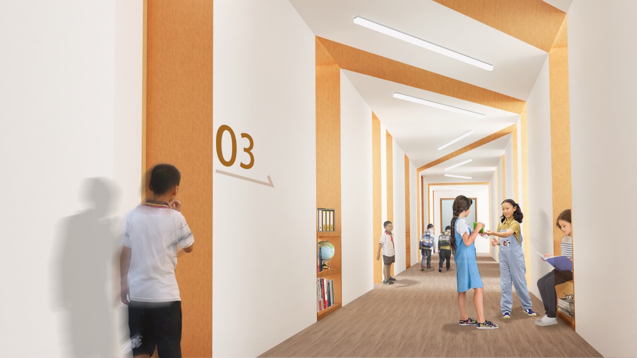 空间的复合化遵循“对内灵活”与“对外开放”“边界模糊与利用”的原则。教学空间的“对内灵活”体现在材料及色彩的灵活运用,以及对灰空间的利用。 “对外开放”体现在教室与外部走廊空间的开放互动。将教室墙壁侧开窗,增加采光量的同时,也利于老师的日常课堂巡查。课间,侧窗也可作为学生休息、存储、娱乐的场地,以点带面,形成活跃的廊道空间氛围。
