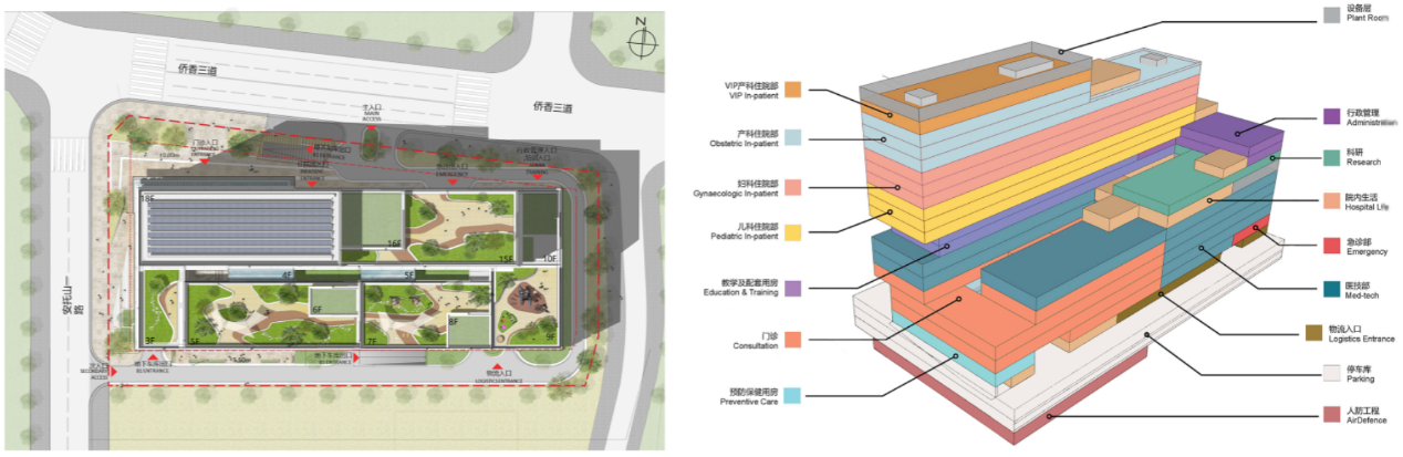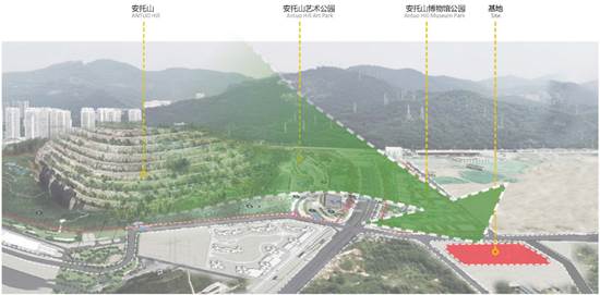 项目紧邻规划中的安托山艺术公园和博物馆公园,安托山公园为医院带来高品质的绿色景观环境。与项目隔路相望的安托山曾是深圳早期填海等重大工程的取石点,承载着深圳发展无比珍贵的历史记忆。建筑形态设计提取安托山独特的梯田台阶地形,根据对项目和基地的理解,顺应人们对希望、快乐、便捷和生态的渴望,妇儿医院的建筑设计提出“绿色生命阶梯”的设计理念。