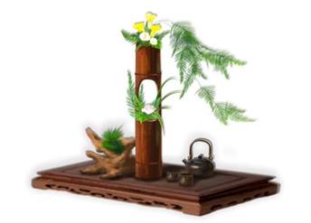 玄关花取用中式传统文人插花“竹阁筒”为花器,并用木根雕造景插制中国传统插花,以提升居室雅致格调。竹阁筒旁根雕上置象征吉祥的菖蒲草和青苔,共同放置在茶席台上造景,取名“雅会”。
