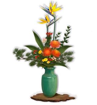 大桌是中餐厅雅间包厢,设有博古架和木隔断屏风。为促进食欲丰富厅内色彩层次,采用对比色系花材。以中号青色冬瓜瓶插制直立式插花,主花材为团状红色枕垫,线条花鹤望兰、点缀红豆等进行花色呼应。