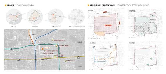 学校位于北京市西城区二环内,西直门内大街与平安里西大街范围内,前半壁街南侧。学校占地面积约为3100㎡,面宽约58.8m,进深约70m。地块最南端的棋院楼也纳入学校改造范围。整体上看,校园空间布局散乱,碎片化严重,室外活动空间局促,缺少绿化用地。主教学建筑为砖混结构,布局死板,门洞口小,走道窄,教室数量少且空间面积小。建筑内部空间陈旧,且采光不足。