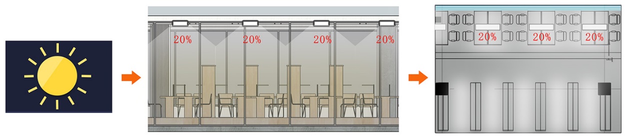 (晴天时,自然光照较为充足。光照达标时则自动关闭灯具;光照不足时,则适当补充。)