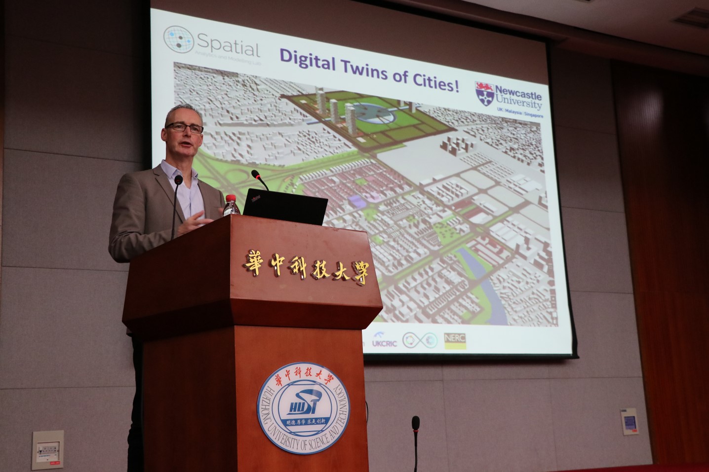 Stuart Barr教授做了题为《Digital twins of cities: understanding the spatiotemporal resilience of cities》的主题报告。以新加坡为例,引出数字孪生技术在改善居民城市生活中的应用,并简要介绍了英国国家层面数据孪生技术的发展框架与英国数字建设中心。在详细解释数字孪生技术的工作框架后,认为其有助于决策者、规划师更好地认识与理解城市系统存在的问题。同时,城市可借助多元大数据进行实时监测与管理,从而更具韧性与可持续性。