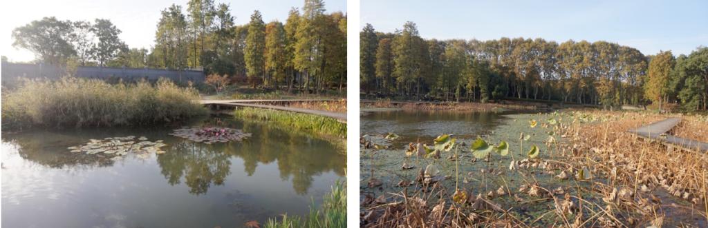 (1)水生植物专类园。包括沉水展示区、睡莲展示区、荷花展示区、湿地植物区、水生生态区。沉水植物是指植物体全部位于水层下面生活的植物,是真正的“潜水高手”。主要有黑藻、竹叶眼子菜、海菜花、苦菜、菹草、水盾草、伊乐藻等。睡莲展示区主要展示睡莲科睡莲属的水生植物,包括喜欢睡觉的睡莲、不能做素菜的慈姑、梭鱼草等。荷花展示区主要展示各种荷花以及可以载人的王莲等。水生生态区(图5)主要展示挺水植物,如荷花、再力花等;浮水植物,比如睡莲、水罂粟等;漂浮植物,比如浮萍、凤眼莲等,叶浮在水面根悬于水中。湿地展示区主要是介绍的功能,湿地与森林、海洋并称为地球上三大生态系统,在抵御洪水、调节气候、涵养水源、降解污染物、应对气候变化、维护全球碳循环和保护生物多样性等方面,发挥着不可替代的重要作用,被誉为“地球之肾”、“物种宝库”和“储碳库”。