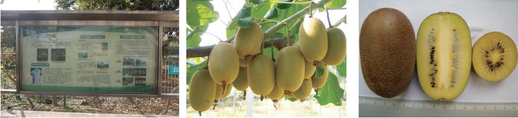 图8 猕猴桃园介绍宣传栏(左)及猕猴桃(中、右图来源于武汉植物园宣传单)