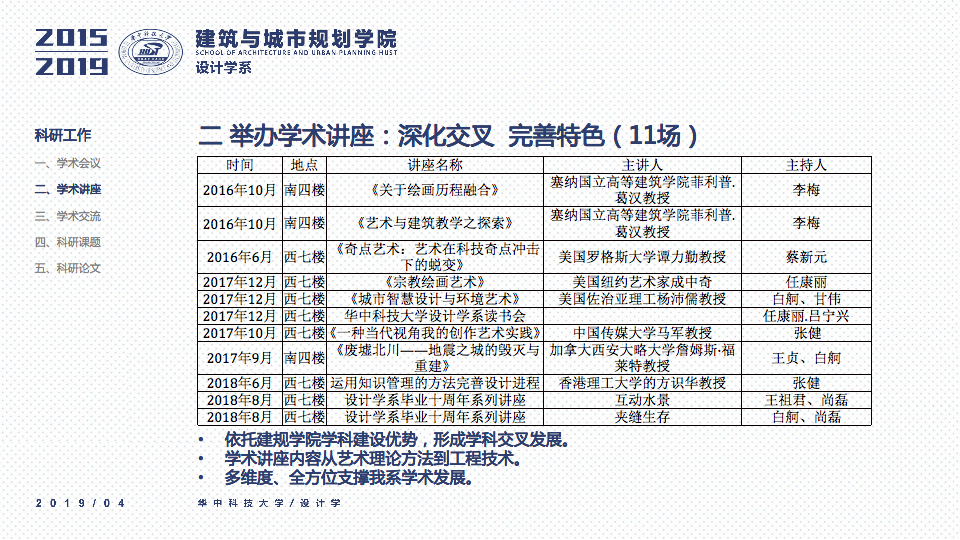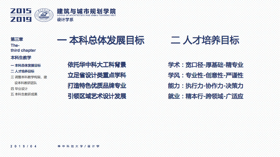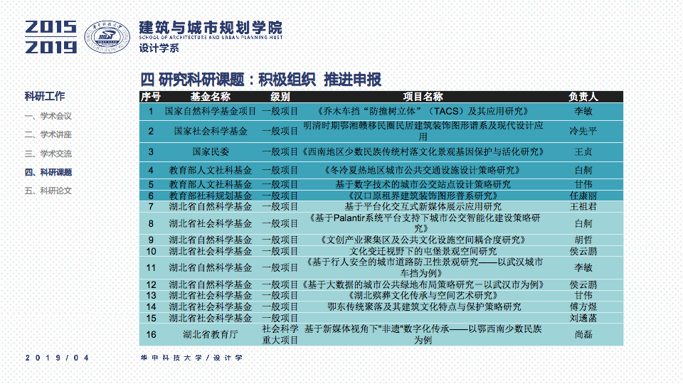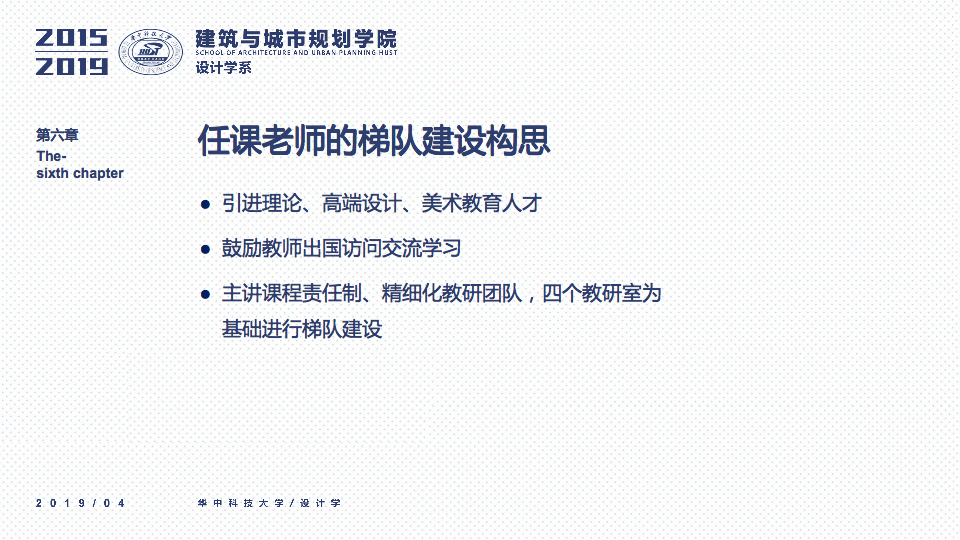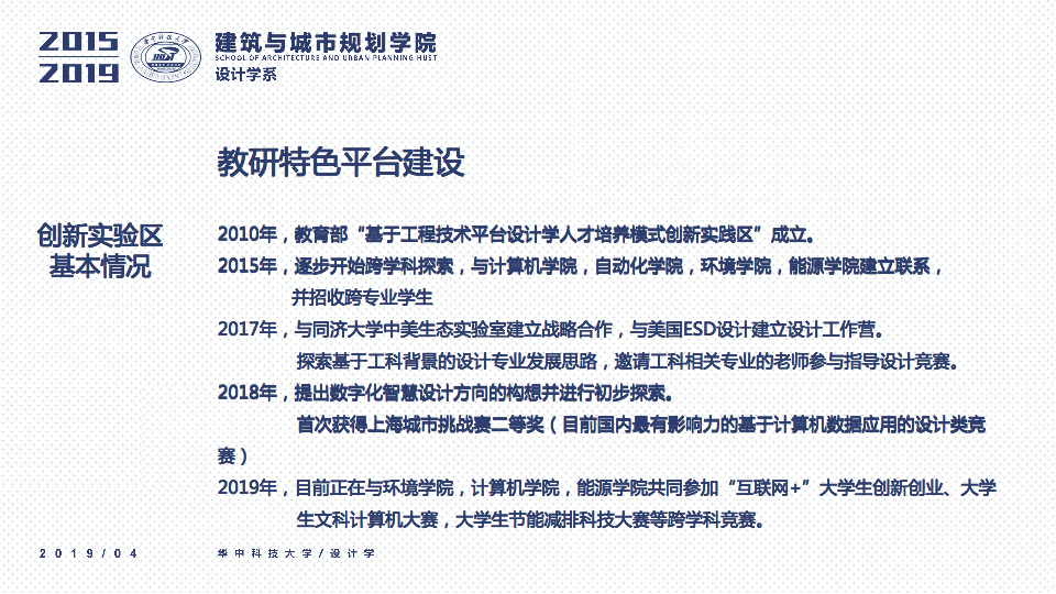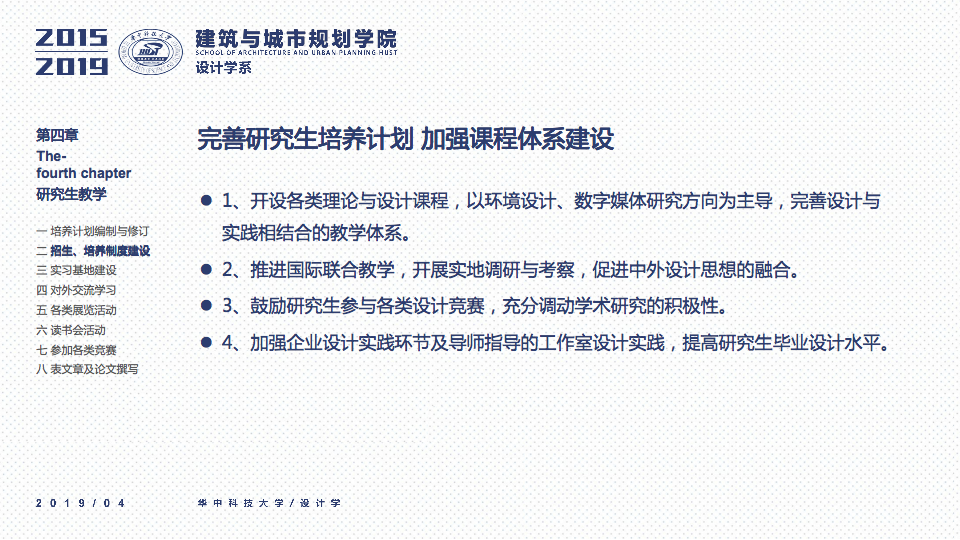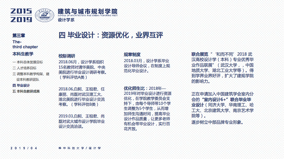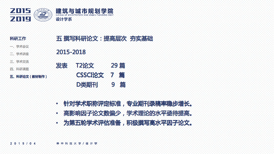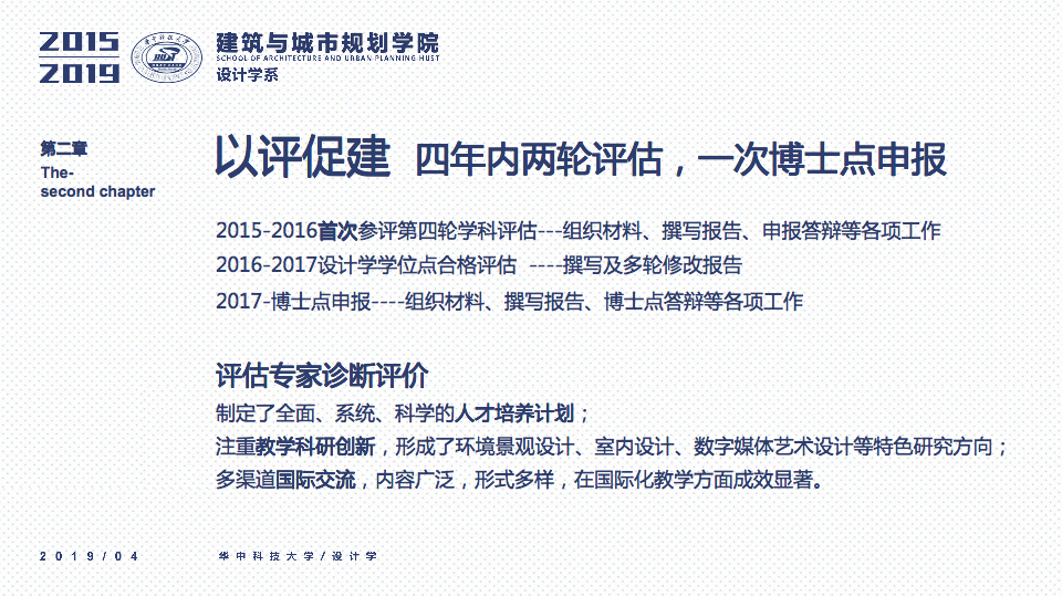 秉承设计学系“学科交叉、突出特色、创新为本”的办学要求,立足于“湖北省品牌学科”、“湖北省重点学科”的基础之上,一直坚持“打造特色优势学科方向及团队”作为学科建设与科研工作的立身之本。四年以来,重点围绕以评促建、本科教学、研究生教学、科研工作、师资梯队与平台建设、成果总结、社会服务等七个方面来开展工作,在以评促建的工作体制下,举全系之力,参与全国高校设计学专业学院等级的排名评估,首次参加第四轮学科评估即获得“B-”等级(并列全国28位),同时通过了设计学学位点合格评估,并组织开展了博士点申报等各项工作。为下一轮评估与申报打下了坚实的基础并取得了宝贵的经验。
