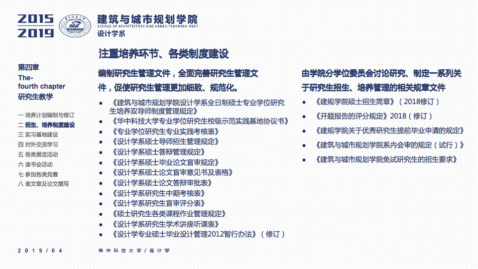 针对研究生培养的专业与市场需求变化,调整了一系列培养方案包括:学术硕士培养方案全日制专业硕士培养方案、非全日制专业硕士培养方案、并新增多门特色课程,包括:研究生高水平课程三门、新增研究生公共选修课程三门、新增研究生联合设计课程一门。同时,进一步完善培养体系建设。完善各环节制度建设。