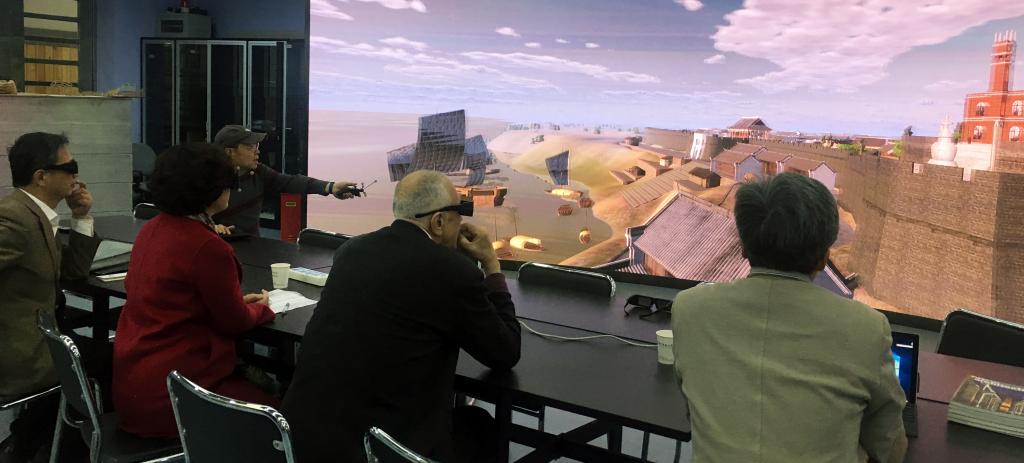 我院的虚拟仿真实验中心依托先进的数字校园基础设施,以建筑遗产保护、文化传承与应用为主题,运用虚拟现实、新媒体等相关技术,是高度集成的具有多学科交叉特点的虚拟仿真实验教学平台。阿克曼先生一行现场体验了我院VR研究教学的成果,其中1911年武昌古城的历史旧景,让人“身临其境”地感受了武汉独具特点的建筑风貌和悠久的历史文化。