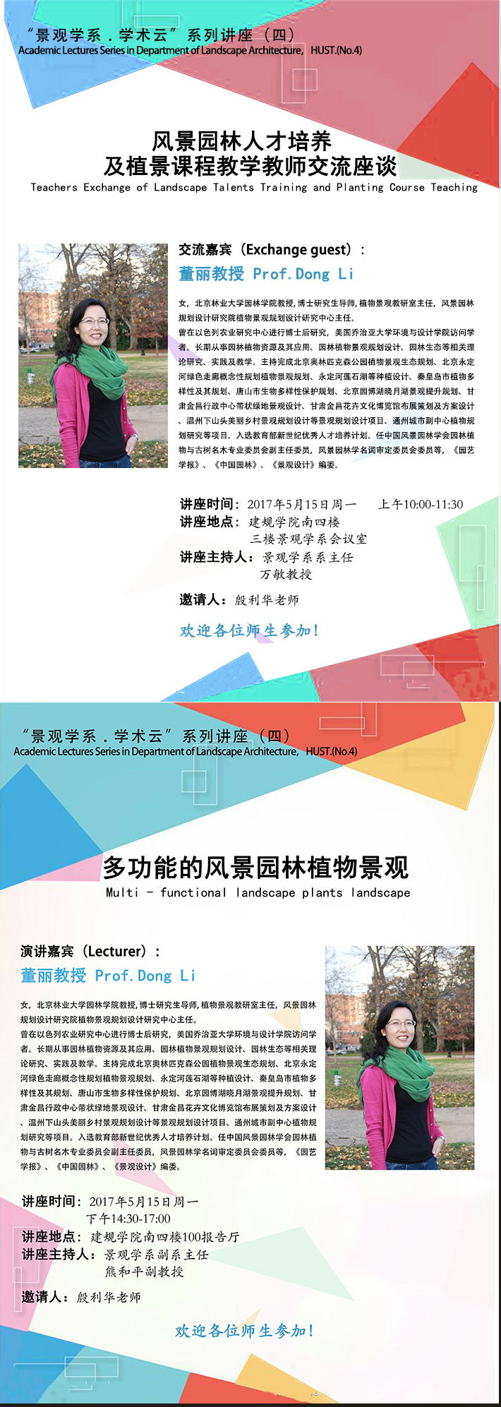 园林植物是唯一有生命的景观元素,如何善待绿色生命并艺术配置,利用它更好的营建理想人居环境,实现真正意义上的生态价值,是每个建、规、景、艺行业中每个设计师需要去懂得的知识。为了积极加强理工科院校风景园林专业园林植景规划与设计教学水平,同时积极回应风景园林学位点评估问题,借鉴和吸收国内植景规划与设计领域最高教学质量的宝贵经验,景观学系特邀请了北京林业大学董丽教授前来我院进行教学经验交流和专题讲座,欢迎各位师生积极参加。
