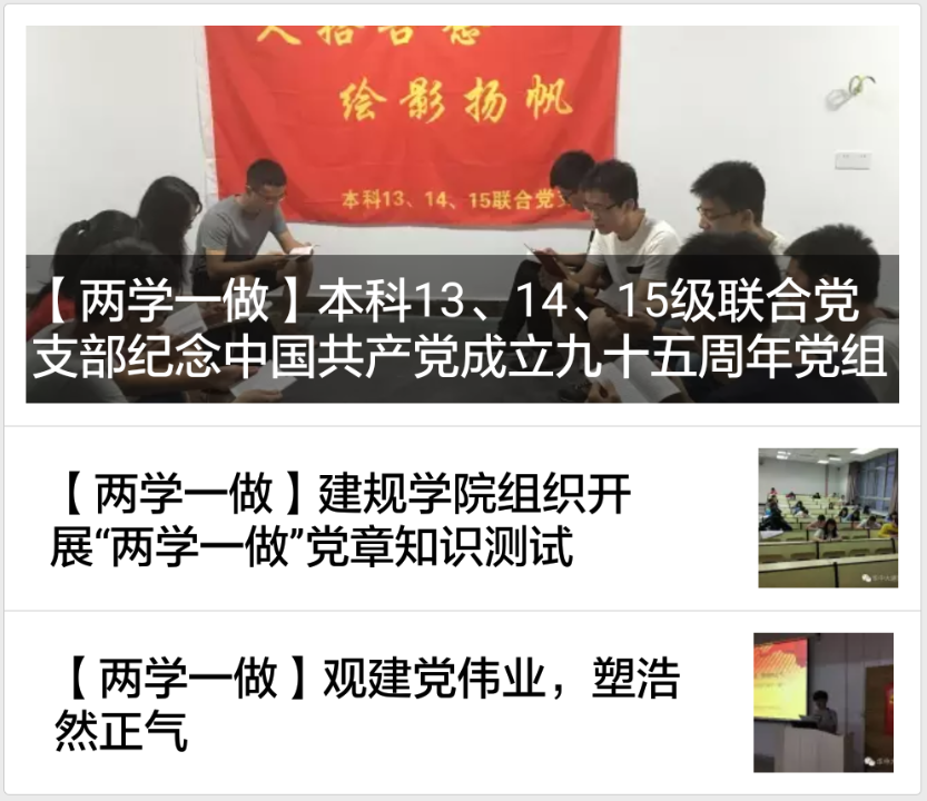 为不断创新党员教育载体,丰富广大党员的学习渠道,抓实推进“两学一做”学习教育,建规学院特于2016年6月初在华中大建规学院微信公众号上开设了“两学一做”专栏。通过“两学一做”专栏,建规学院及时报道学院各师生党支部“两学一做”学习教育的开展情况,并对一些支部好的经验和做法进行梳理总结,供其他支部进行参考和学习,在广大师生党员中明显引起了强烈的反响,为学院“两学一做”学习教育营造了良好的氛围。