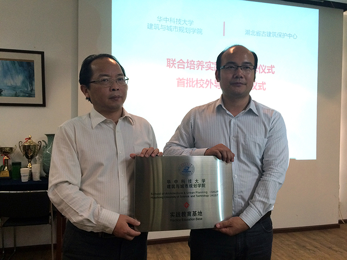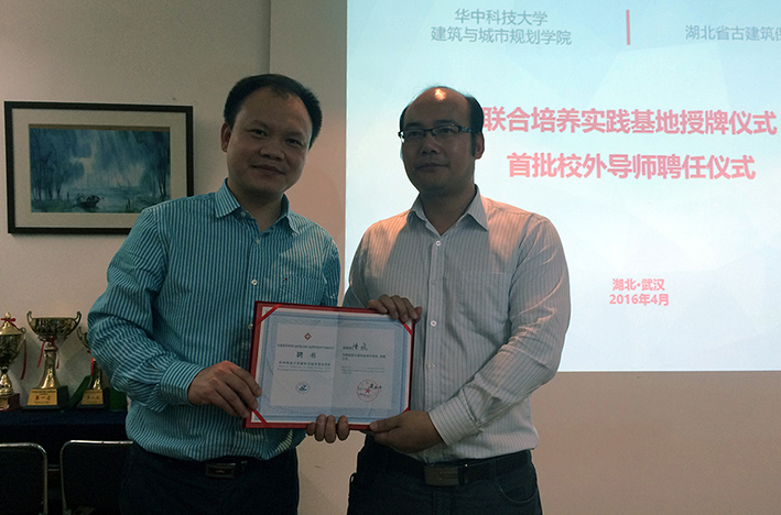 2016年4月14日下午,太阳集团网站8722与湖北省古建筑保护中心研究生联合培养实践基地授牌仪式举行,建规学院院长黄亚平与湖北省古建筑保护中心主任陈飞签订合作协议,一批古建筑保护中心的资深人员被聘为太阳集团8722c校外导师。