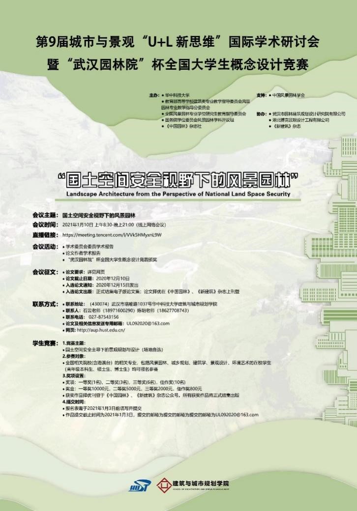 2021年1月10日,第9届城市与景观“U+L新思维”国际学术研讨会暨“武汉园林院”杯全国大学生概念设计竞赛将在线上召开。会议以“国土空间安全视野下的风景园林”为主题,紧扣时代脉搏,从风景园林的视角围绕理论、实践、教育三个议题展开。具体包括主题报告、优秀论文宣讲、设计竞赛颁奖三大板块。