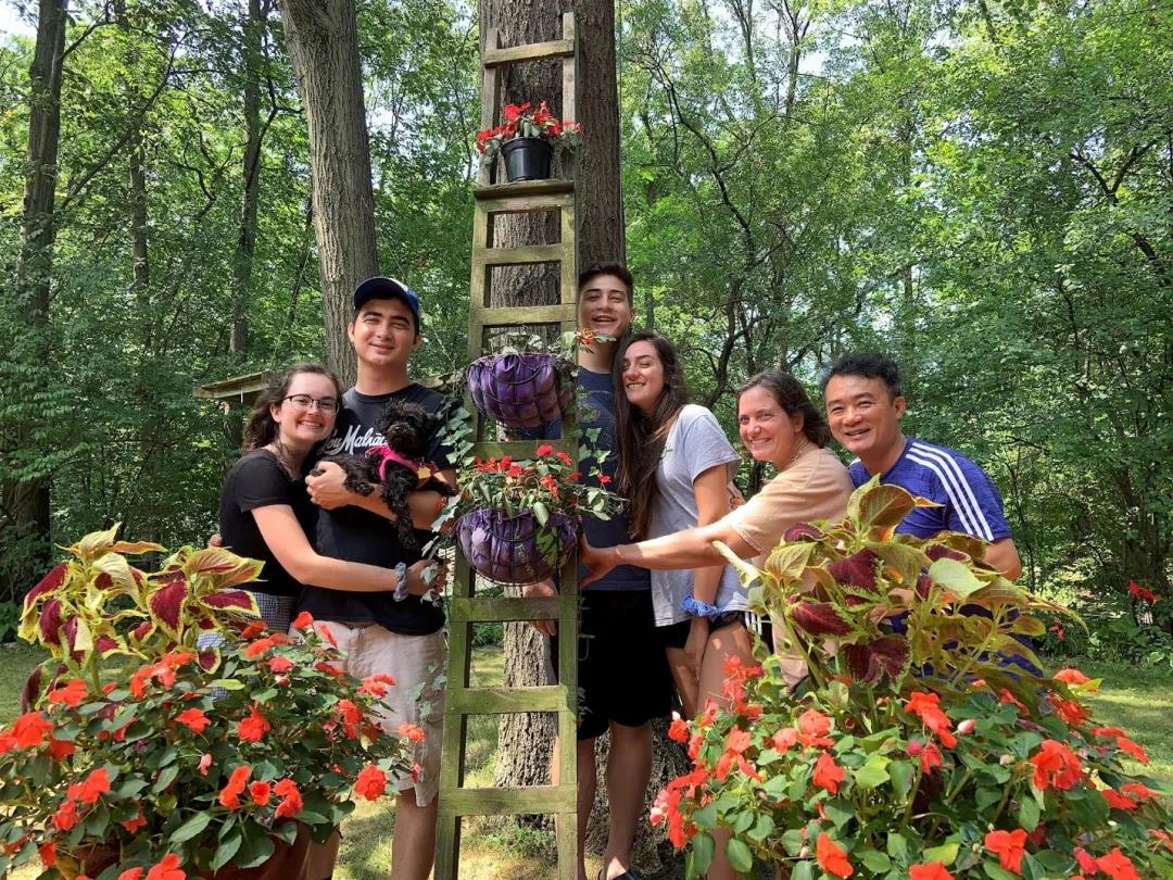 唐军建幸福一家, taken at his backyard. His wife Brooke Tang 唐小溪, his older son Noah Tang 唐海明 and his fiancé, his younger son Jeremy 唐海洋 and his girlfriend