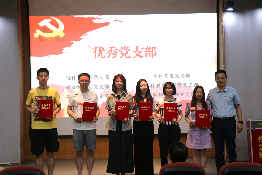 首先,由院党委书记钱思为优秀党支部颁奖。获奖党支部有:设计系教师党支部、本科艺设党支部、硕20级规划党支部、硕19级规划党支部、本科16级规划党支部、本科规划低年级党支部。颁奖后钱思与获奖支部代表合影留念。