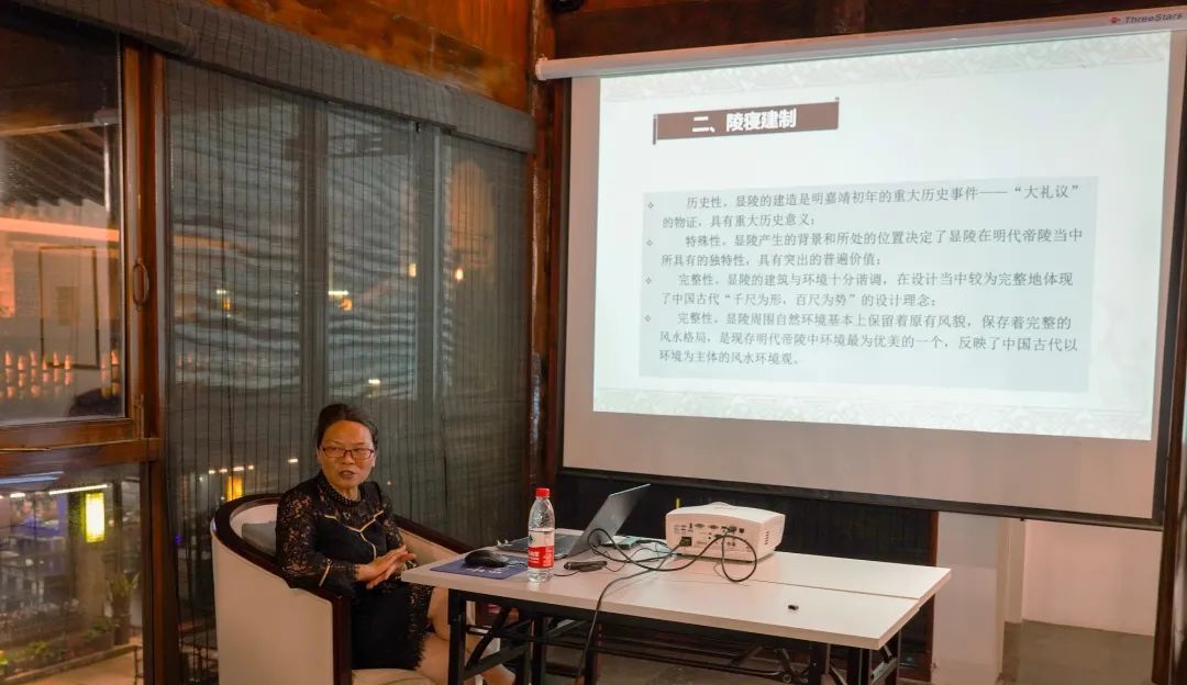 随后讲座正式开始,周老师首先讲述了明显陵的兴衰背景,从《显陵碑文》、《承天大志》、《兴都志》等文献记载中点出了陵园选址的风水考究,嘉靖皇帝对于提升显陵地位的决心坚持以及明末农民起义显陵被毁的兴衰赓续,一副生动的历史画卷在同学们面前徐徐展开。其后,周老师用历史性、特殊性、完整性和真实性这四种性质精要概括了明显陵的建制格局,并结合实物留存深入浅出的引导同学们去感受显陵领悟显陵。最后周老师以一种俯瞰式的视角,带领同学们从整体上把握了显陵的风水意向与环境形势。