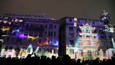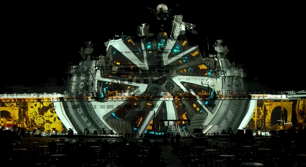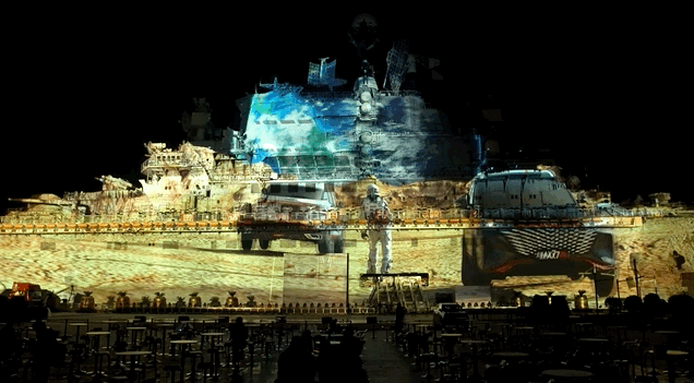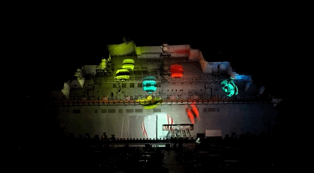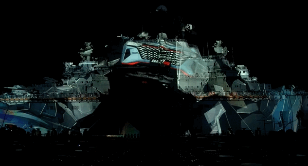 本场投影秀使用42台40K工程投影机同时工作,覆盖“基辅号”航母整个舰体,通过裸眼3D动画再配合百余台可编程控制的光束灯以及五台激光灯共同绚丽演绎16k视频的超高难度震撼画面,让数千名现场观众经历了一段回味无穷的光影探索之旅!