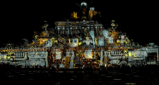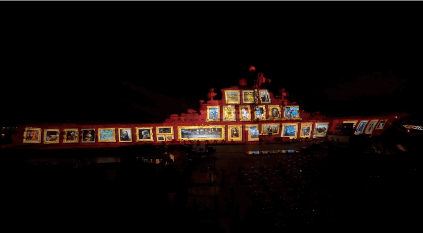 基辅号全长近300米,体量之大给投影秀的制作带来了重重困难,工程团队进行了大量的相机设定,寻找最佳角度,现场通宵测试效果,以期完美。