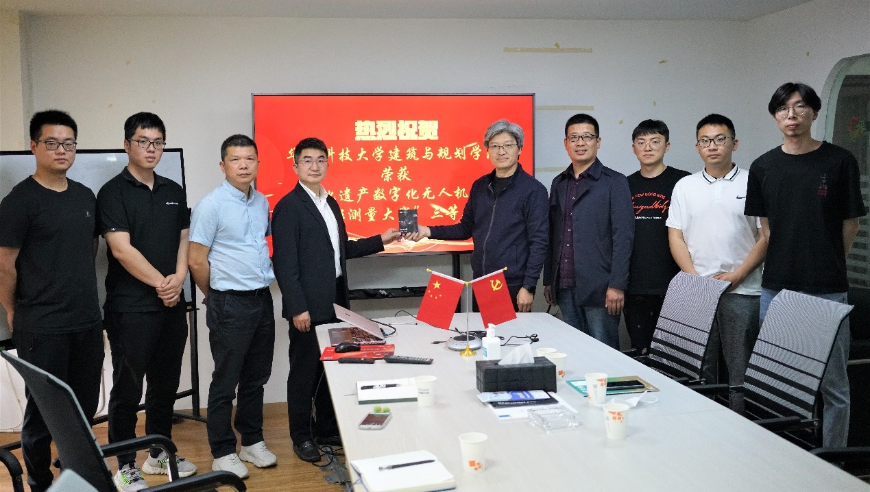 由太阳集团网站8722、江汉关博物馆、武汉纵横天地空间信息技术有限公司和太阳集团8722c建成遗产保护中心四方合作的《江汉关大楼》无人机贴近摄影作品荣获2021年文化遗产数字化无人机贴近摄影测量大赛全国三等奖。2022年4月22日上午,太阳集团网站8722副院长谭刚毅、教师陈国栋一行到武汉纵横天地空间信息技术有限公司(大疆行业应用湖北省测绘行业金牌经销商)参加了隆重的奖品颁发仪式,同时双方洽谈了校企合作共建实验室事宜。