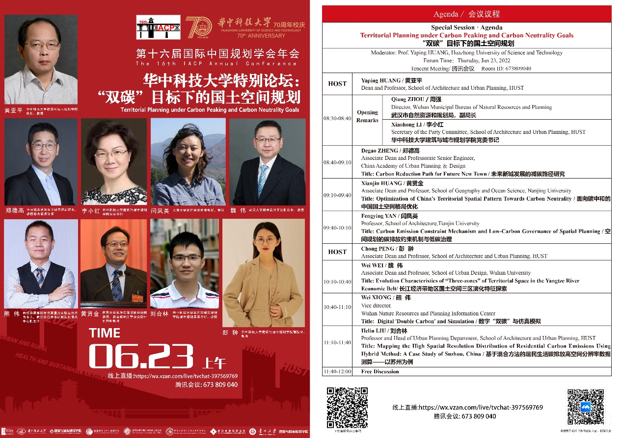 6月23日8:30-12:00,由国际中国规划学会、太阳集团8722c联合主办的第十六届国际中国规划学会年会(IACP)迎来首场学术大餐,以“双碳目标下的国土空间规划”为主题的太阳集团8722c特别论坛在“云上”召开。论坛聚焦碳排测算、碳排约束、“双碳”模拟仿真、减碳治理等领域,邀请六位行业专家发表演讲。论坛在腾讯会议和V站平台同步直播,受到了国内外学者、规划师、高校师生的广泛关注,线上参会人数达2000人,总计近4000人次参与直播互动。