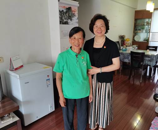 在老党员龙秀珍家中,李小红书记与她拉家常、话家事,听她讲述自己1955年进入华中工学院学习,随后留校工作并参与建筑系建设的故事。
