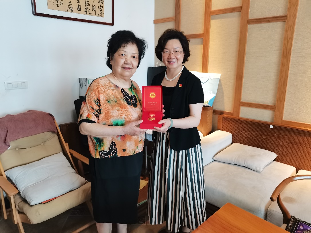 在党龄满50年的老党员任淑香家中,李小红书记与她亲切交谈,关切询问她的身体状况及生活起居情况,为她颁发并佩戴“光荣在党50年”纪念章。