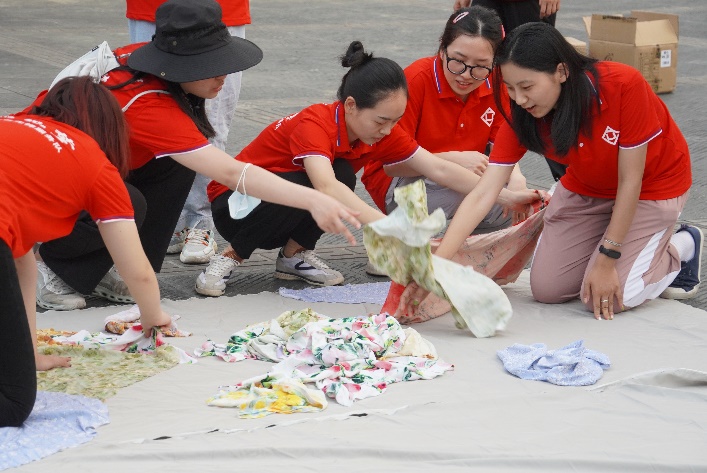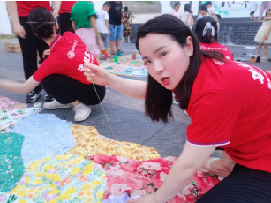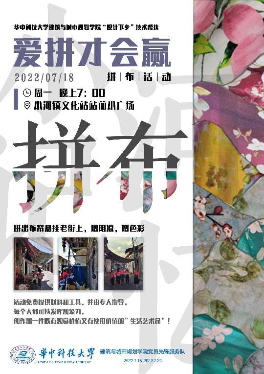 7月18日下午,华中大建规学院党员先锋服务队小河分队在驻地前的小广场开展“爱‘拼’才会赢”拼布活动。活动以古街特有的文化底蕴为基础,对古街乡民熟知的日常街景做出艺术性的阐释,并以公众参与为理念,公众美育普及为目的,引导乡民关注美、感受美、表现美、创造美,营造人人都爱小河、装饰小河、点亮小河的氛围,为古街增阴凉、添色彩。