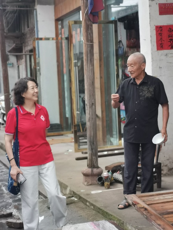 沿石板路走进小河古街,顺着屋檐零散地悬挂着几块碎布拼制而成的布帘。“古街到了夏天,特别是中午的时候,又热又晒,把家里闲置的布块挂起来遮阳,大家才愿意在我们店门口买东西嘞。”家门口搭个布,下午搬个凳子就可以在下面聊天乘凉了。乡民带着同学们沉浸式体验了一番古街生活。