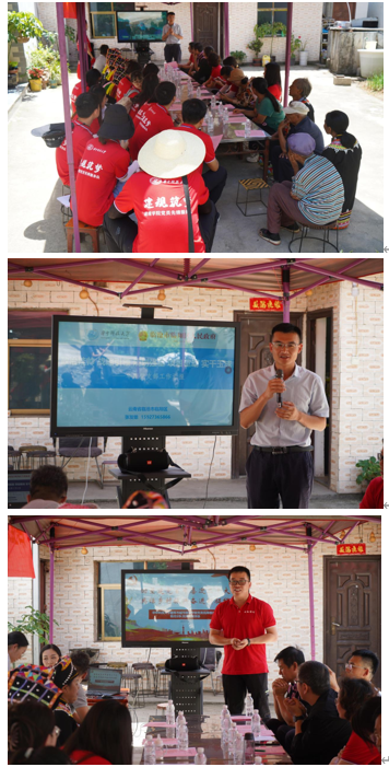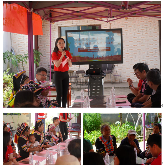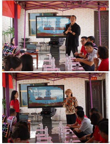 参会人员移步大榕树下、服务队自主设计的彩绘墙前,建规学院教授陈锦富介绍了融合拉祜族特色的图案设计理念和龙洞亲子研学产业发展规划,并邀请实践队员与蚂蚁堆村村民绘制民族彩、按下同心印、共话振兴路。