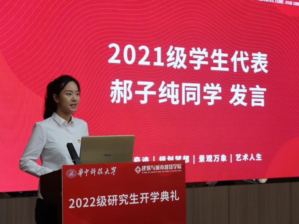 2021级研究生郝子纯同学向师弟师妹分享了自己在华中大的体验与收获。她从校训的角度出发,用激昂的文字、饱满热情的声音号召同学们做新时代的华中大人,携手并进,在亿万人民为实现中国梦而进行的伟大奋斗中实现人生价值,用青春书写无愧于时代、无愧于历史的华彩篇章。