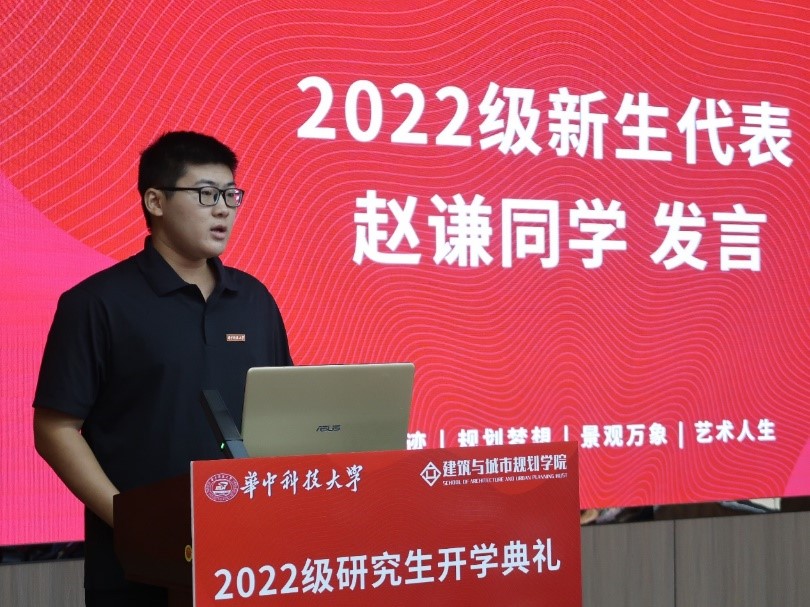 2022级新生代表赵谦同学代表全体新生祝福华中大建校70周年生日快乐,并代表全体新生扬青春誓言:做勤学善思的建规学子;做求真务实的华中大人;做敢为人先的新时代青年;全体新生传承为国为民的华中大精神,成为顶天立地的华中大青年,以奋斗擦亮青春最亮丽的底色,与华中大共同开启七秩新篇章。