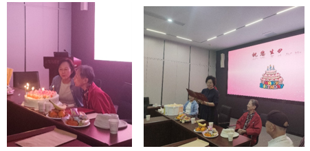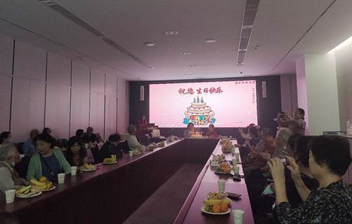 李小红书记当众宣读了校党委统战部写给侨眷曾丽仙老师的祝寿信,传达了学校党委对寿星的关怀和美好祝愿;随后,全场为三位寿星庆祝生日。黄丽娟老师为两位到场寿星带生日帽,杜筱玉老师一展歌喉,用嘹亮的嗓音带领全场教师齐唱生日快乐歌,现场气氛热闹而温情。到场的2位寿星也共同许愿,齐声祝福学校、学院能够越来越辉煌!