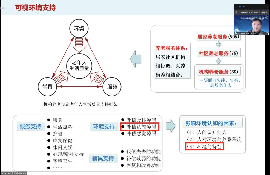 哈尔滨工业大学卫大可副教授以《机构养老设施的环境认知性能测量》为题,指出我国养老体系正在建设中,环境、辅具、服务三个维度对老年人生活质量有重要影响。基于空间句法对空间性能进行分析,建立了单一空间数学模型。此外,对环境色彩的适老性能进行了研究,通过VR虚拟实验确定参数阈值,未来将根据实际使用情况进行结论验证。