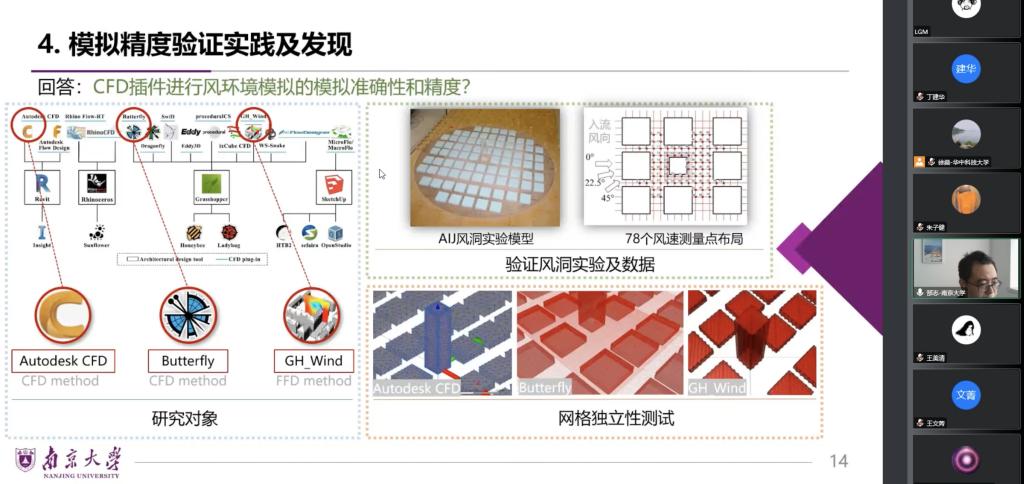 南京大学郜志副教授以《基于建筑设计平台的城市风环境模拟》为题,指出城市化进程导致城市通风性能下降、热岛强度增强、污染物积累等一系列城市环境问题,通过文献综述的方法回答了建筑设计平台上的CFD插件种类及其优劣、应用场景、应用及其模拟尺度、准确性和精度问题,建议使用者针对具体的研究需求选择合适的插件。