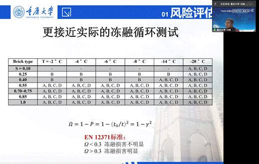 重庆大学冯驰教授以《传统建筑外墙内保温改造:冻融风险评估与控制》为题,讲述了传统建筑内保温的风险评估方法和控制策略。在风险评估方法中,通过实验测试的方法检查直接测试所存在的工况过于极端的问题以及间接评估存在的可靠性有限的问题,研究指出更符合实际使用情况的实验判断更为可靠。在冻融损害控制策略中,通过实验验证了使用憎水剂处理外墙能降低内保温改造的冻融风险。
