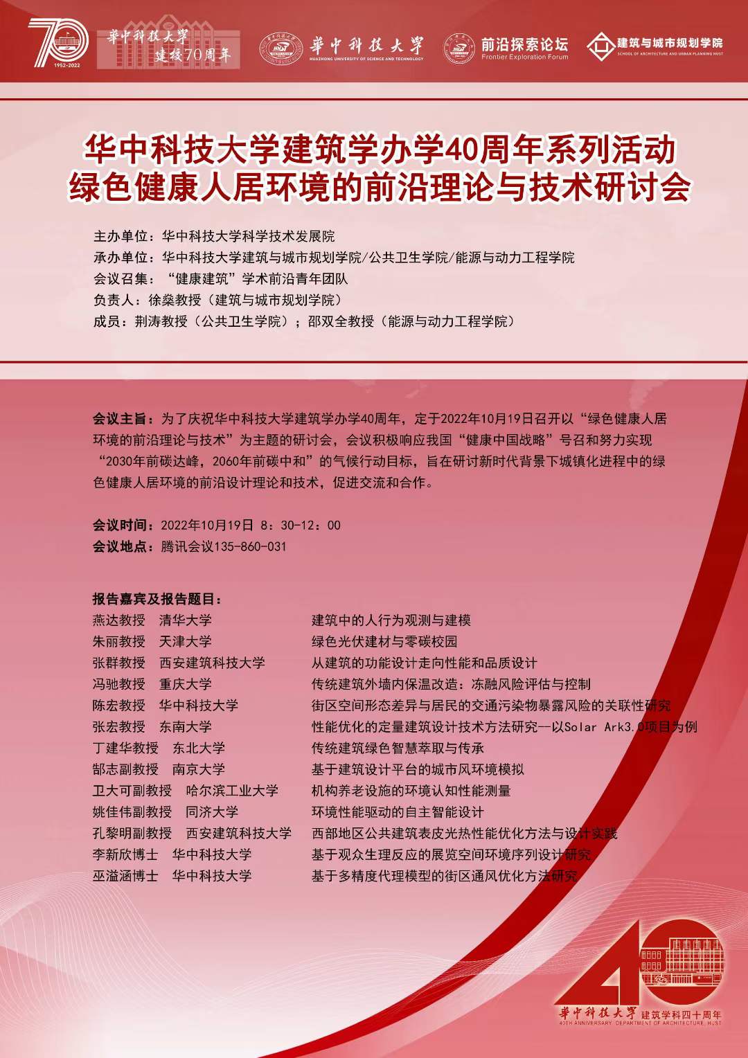 2022年10月19日,绿色健康人居环境的前沿理论与技术研讨会于线上顺利召开。会议积极响应我国“健康中国战略”号召和努力实现“2030年前碳达峰,2060年前碳中和”的气候行动目标,邀请了众多学者探讨如何对绿色健康人居环境进行指标评测、要素关联关系挖掘以及性能优化与设计实践等。论坛由太阳集团8722c科学技术发展院主办,太阳集团网站8722、公共卫生学院、能源与动力工程学院共同承办。