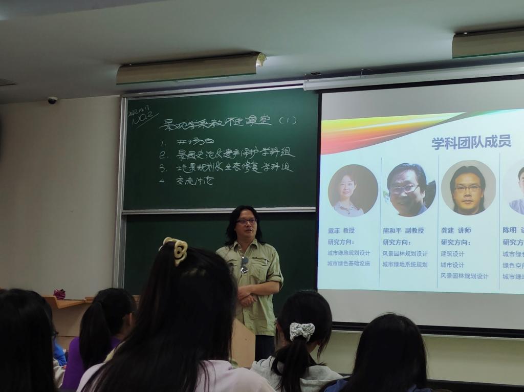为增进风景园林大一新生的“归属感”和师生情谊,与即将开展的本科生导师制相匹配,景观学系分管本科的副系主任殷利华副教授以课程《风景园林专业导论》为契机,提出各个学科团队进课堂,通过老师介绍、师生互动的方式,增加大一新生对风景园林专业与景观学系各位老师的了解。