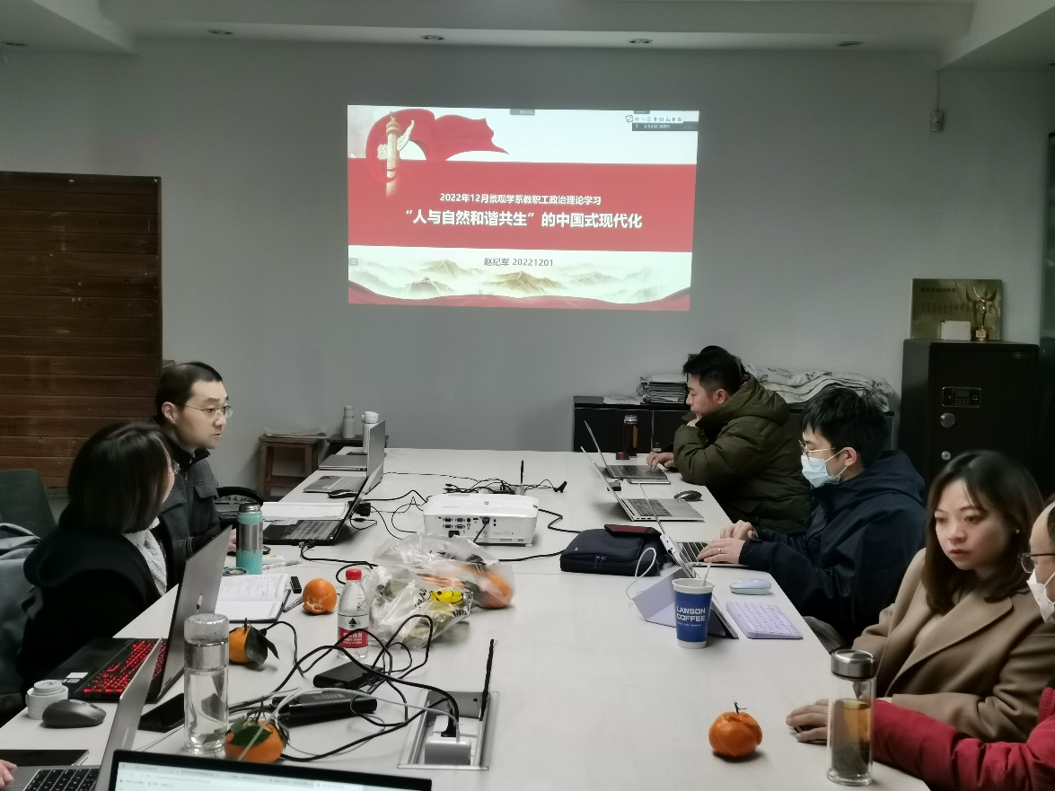 为了加强教师的政治理论学习,赵纪军面向全系教师进行微党课教育(图3)。微党课的主题为“人与自然和谐共生”的中国式现代化,主要基于党的二十大的相关内容进行讲解。赵纪军从该主题发展的时间线进行讲述,梳理出我国不同时期相关的理论思想。例如,建国前各种探索,将毛主席提出的理论总结为三点:重视山林分配、农林水利、救济荒灾;改革开放前(毛时代),主要提出“植树造林”“勤俭节约”两大思想,代表朴素的生态文明思想;20世纪90年代中期,提出可持续发展观、环境的经济价值等更多的环境保护思想,进一步强调资源的合理利用;党的十九大提出两山理论等。