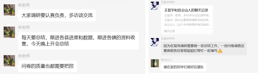由于疫情原因,部分团队成员未能及时抵达现场调研。为充分利用团队资源,团队采取同步开展线上线下的工作模式,线下实地调研成员主要负责外业踏勘、访谈记录、照片采集等工作;线上团队成员则作为后援军,对线下成员收集到的访谈数据进行及时的系统录入,同时对网上相关资料进行汇总并根据线下调研情况同步更新,为开展县市报告做好准备。线下调研团队共分成三组,分组前往3个镇。当入户调研成员通过问卷及访谈得知村建设亮点或问题时,便对接户外调研成员进行实地踏勘、拍摄照片作为资料依据,同时,户外调研成员踏勘发现的问题也及时与入户调研成员沟通,让其向陪同的领导及村民进行进一步访谈咨询,明确乡村建设亮点及存在问题,作为线上线下集体讨论乡村建设进展的资料来源。整体上此种工作方式促进了团队内部的交流合作,充分利用了团队资源,进一步推动了乡村建设评价工作的高效开展。
