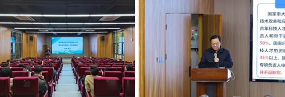 刘伟副院长对现阶段科技人才形势与资助体系、国家自然科学基金申报、科学技术奖励工作等方面进行说明。刘伟强调我国当代青年科技人才的职业生涯与到本世纪中叶全面建成社会主义现代化强国的时间高度契合,望我院科研人员应积极申报基金和人才项目。