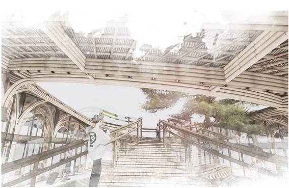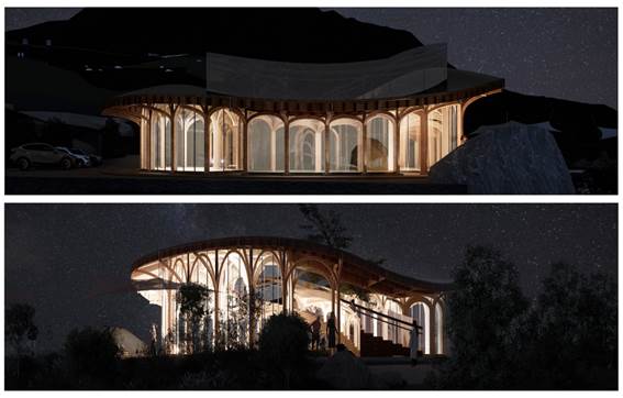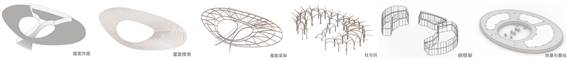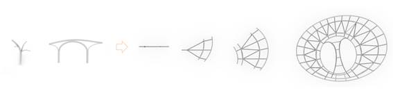 整体的结构生成,为实现进深方向较大跨度,和满足屋顶自由的起伏,设计采用每一排采用双层拱的形式。这样既能获得较大的跨度,同时仅需通过调整上层拱的形状便能适应起伏的屋顶,以这样一个排架为基础,向两边继续延伸出了中间的柱,以此为单元,顺应屋顶的形式,便形成了整个结构体系。同时可以注意到,将拱连成环状,形成向内的约束,正好可以解决拱的侧推力问题。
