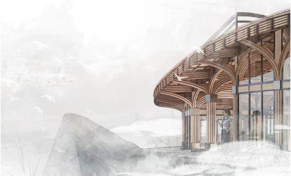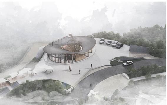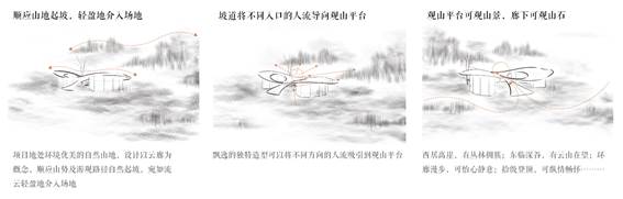 因此,从场地自然环境出发,以云廊入峦为主题,希望建筑能像一朵云一样,悬停在崖边。形体上,顺应山势,轻盈地介入场地,通过坡道将五湖四海的游客吸引到观山平台。通过弧形的建筑面与复合的观景层次,尽可能地发挥场地的景观优势:西居高崖,有丛林簇拥,东临深谷,有云山在望,环廊漫步,可怡心静意,拾级登顶,可纵情畅怀。