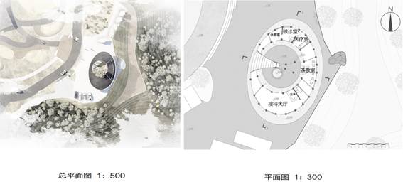 下面是平面布置。将建筑置于临崖一侧。增强建筑与巨石和悬崖的联系,透过视线通廊隐约可见巨石,引人深入一探究竟,并在西侧留出了足够的集散空间。建筑内部分3段,南侧设接待大厅,临近停车场,东侧临近巨石与悬崖,为茶歇室,北侧为医疗后勤空间。
